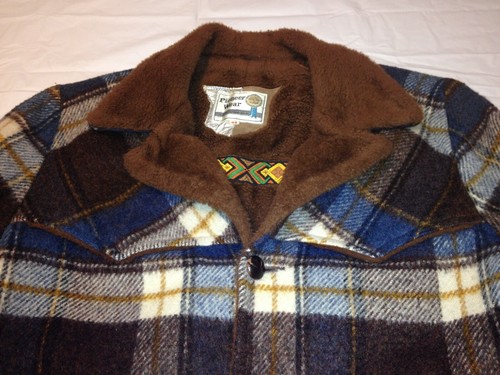 Pioneer Wear Vintage Sherpa Jacket Size 44 Brown Blue White Plaid Wool Coat Ebay